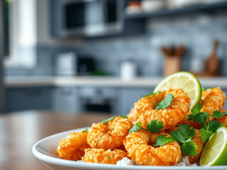 Dip shrimp in egg, then coat with coconut flakes and breadcrumbs.