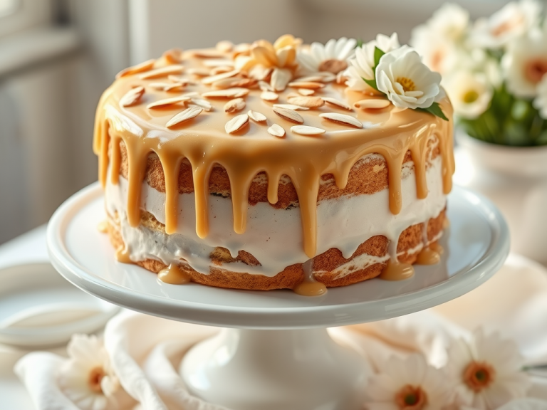 A nutty almond cake infused with amaretto liqueur, topped with almond slivers.