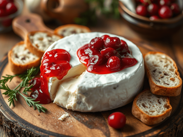 Warm and gooey brie topped with sweet cranberry sauce, served with crackers.