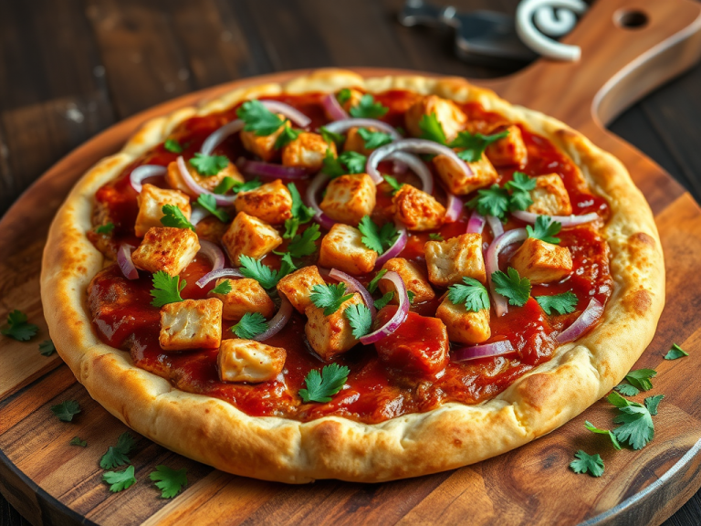 This BBQ chicken pizza brings a smoky, tangy flavor with tender chicken, barbecue sauce, and a blend of cheeses on a crispy crust.