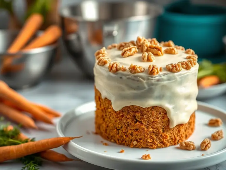 A moist spiced cake packed with carrots and crunchy walnuts, topped with cream cheese frosting.