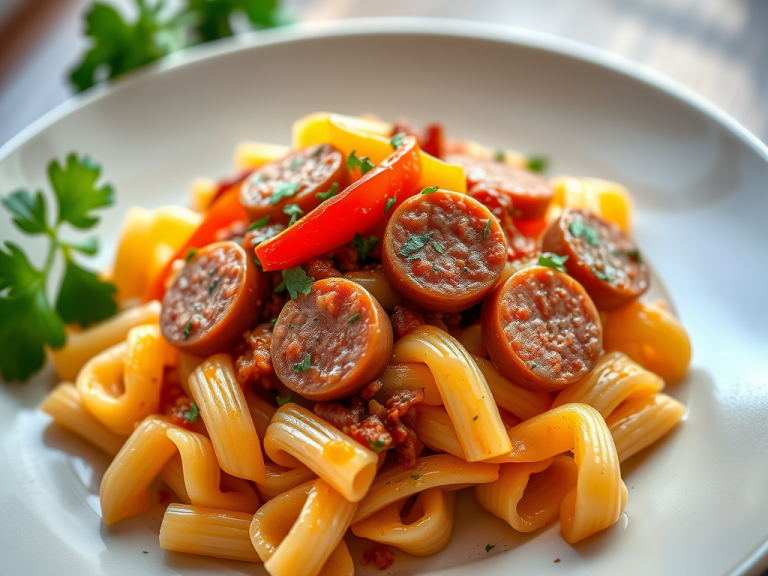 Flavorful cavatappi pasta with Italian sausage and colorful bell peppers in a tomato sauce.