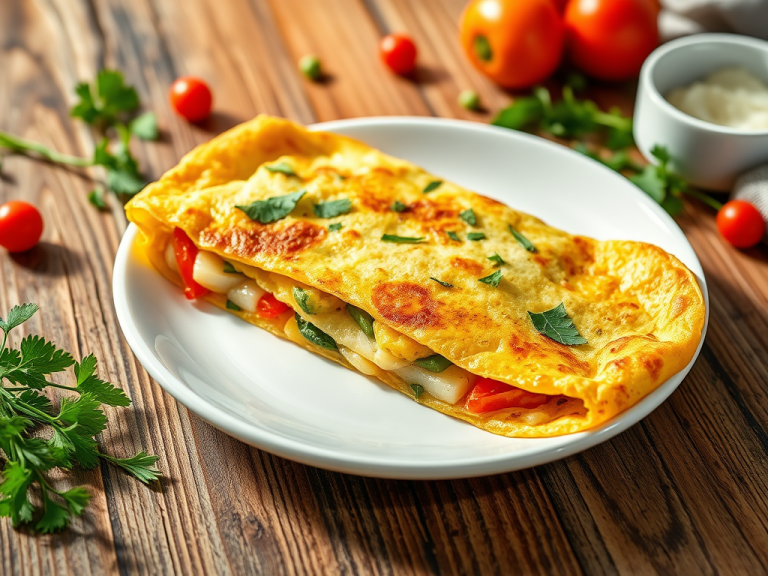 A fluffy, golden omelet filled with cheese, vegetables, and herbs for a hearty and satisfying start to your day.