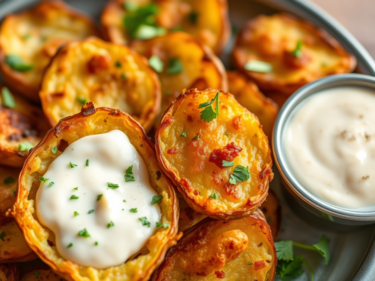Crispy potato skins loaded with cheese, bacon, and green onions.