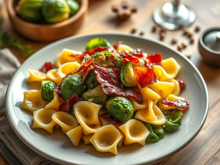 Farfalle pasta with roasted Brussels sprouts and crispy bacon, a fall favorite.