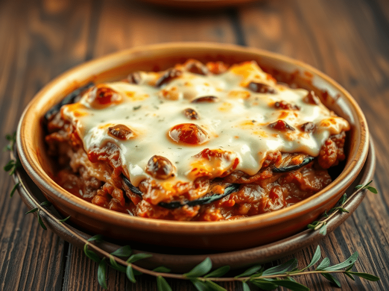 Layer eggplant, beef, and béchamel in a baking dish, bake at 350°F (175°C) for 45 minutes.
