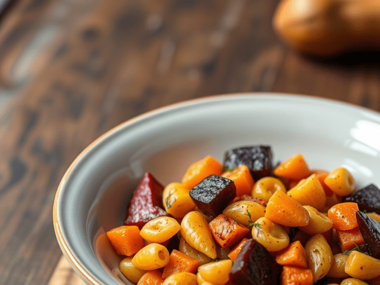 Orecchiette pasta with roasted carrots, parsnips, and beets in a garlic butter sauce.