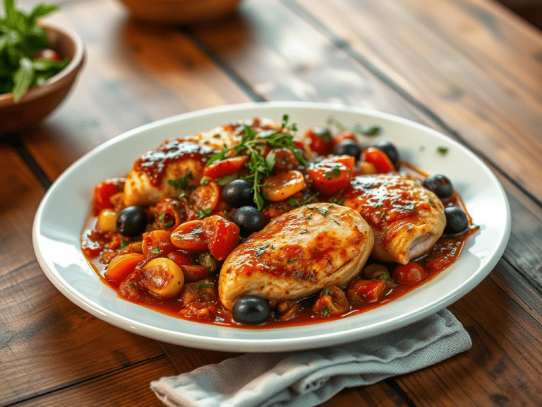 Rustic Tuscan chicken stew with tomatoes and herbs.