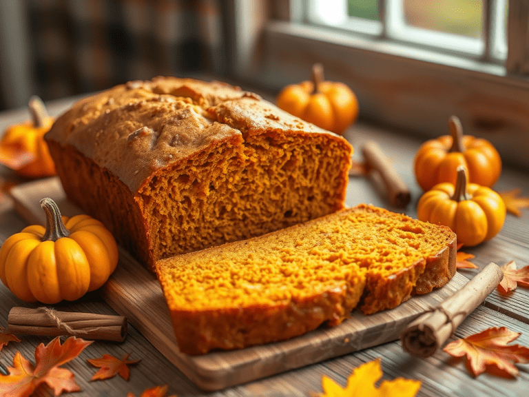 Moist pumpkin bread with warm spices, perfect for fall mornings or dessert.