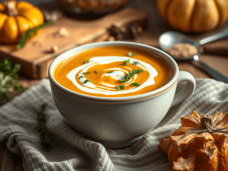 Creamy pumpkin soup with warm spices, perfect for a cozy fall appetizer.