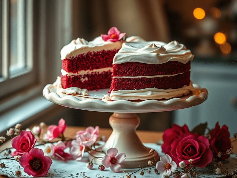 A classic Southern cake with a hint of cocoa and vibrant red color, topped with cream cheese frosting.