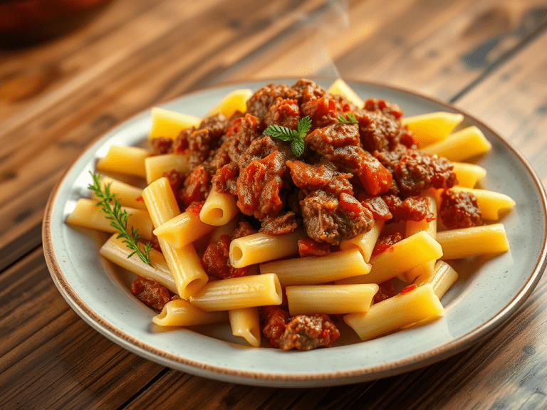 Hearty rigatoni pasta with a rich, slow-simmered meat ragu sauce.