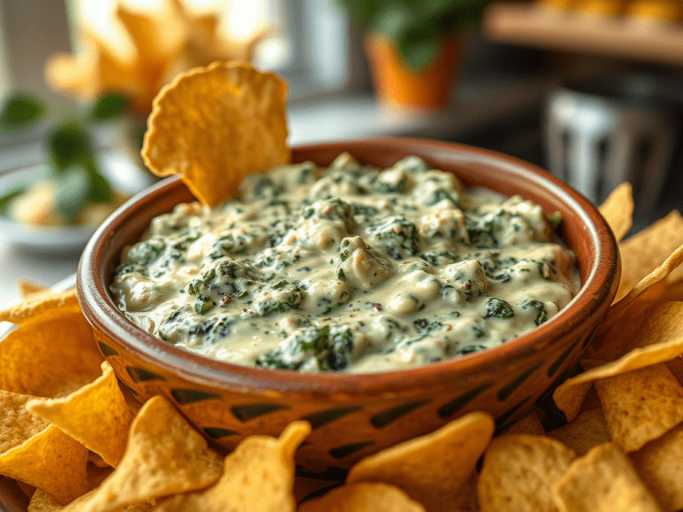 Creamy and cheesy dip with spinach and artichokes, perfect for dipping with chips or bread.