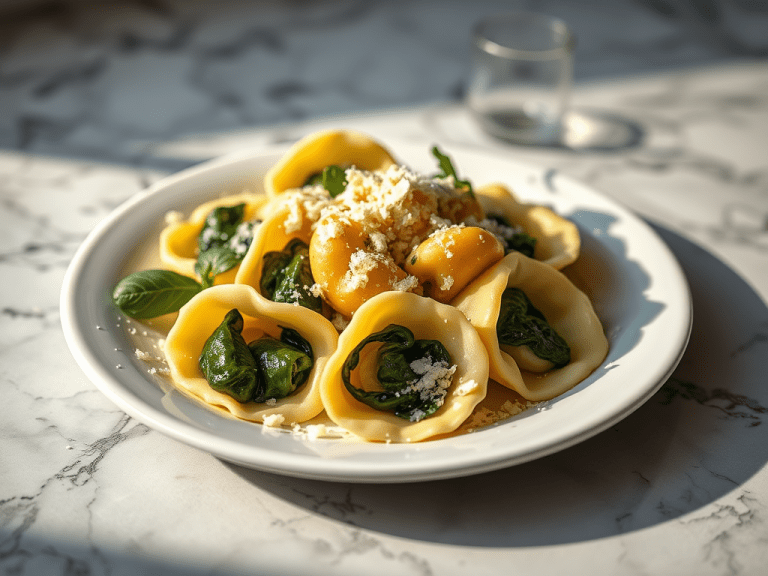 Cheese-filled tortellini with a creamy spinach and ricotta sauce.